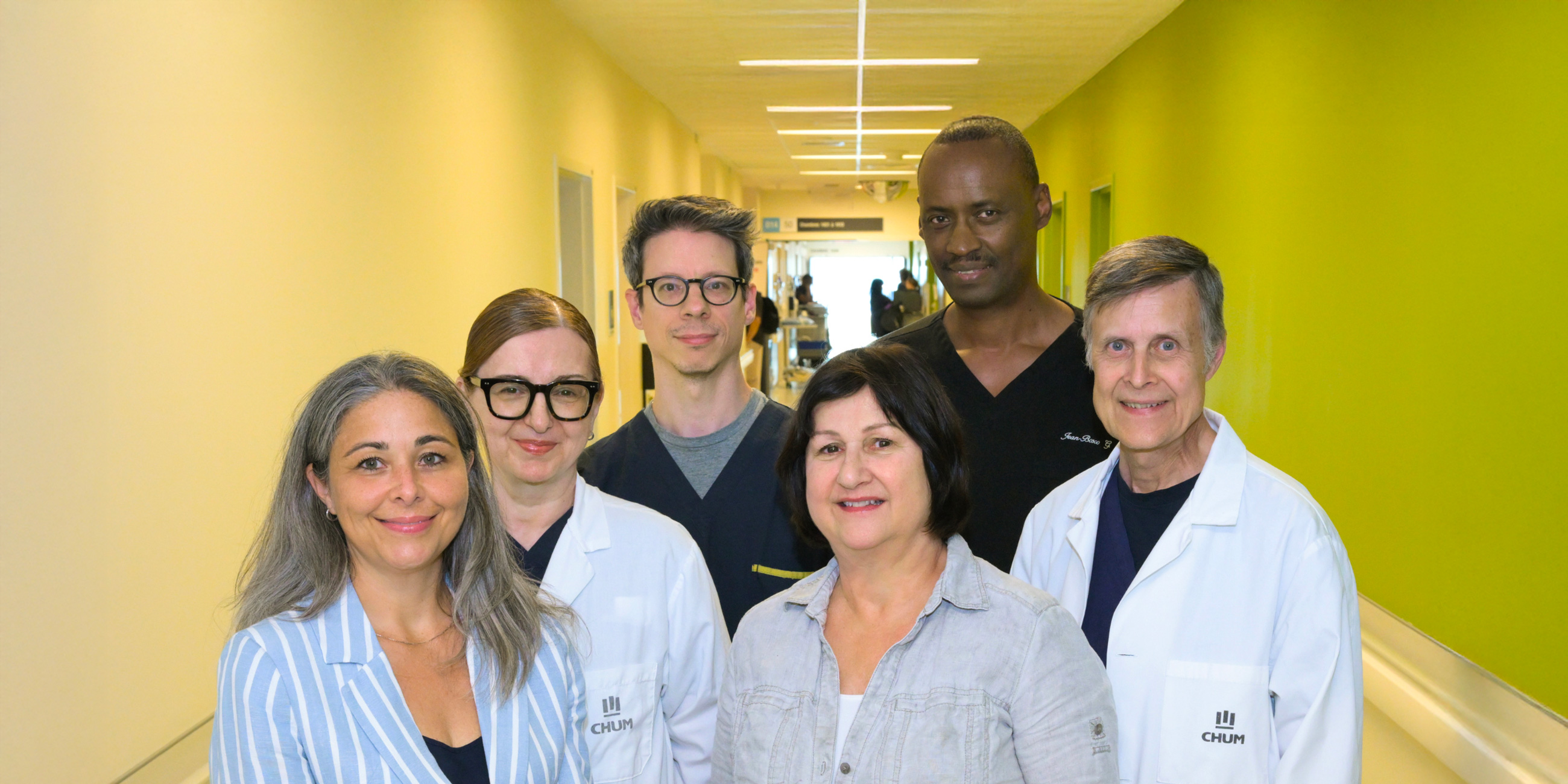 Dominique Paré, à l’avant-plan sur la photo, a à cœur que les soins spirituels soient reconnus à leur juste valeur. La cheffe de service est accompagnée par l’équipe dévouée des intervenantes et intervenants en soins spirituels du CHUM. Dans la première rangée, de gauche à droite : Danièle Bourque, Martine Caillier et André Desautels. Dans la deuxième rangée, de gauche à droite : Martin Paquette et Jean-Bosco Gakwisi.