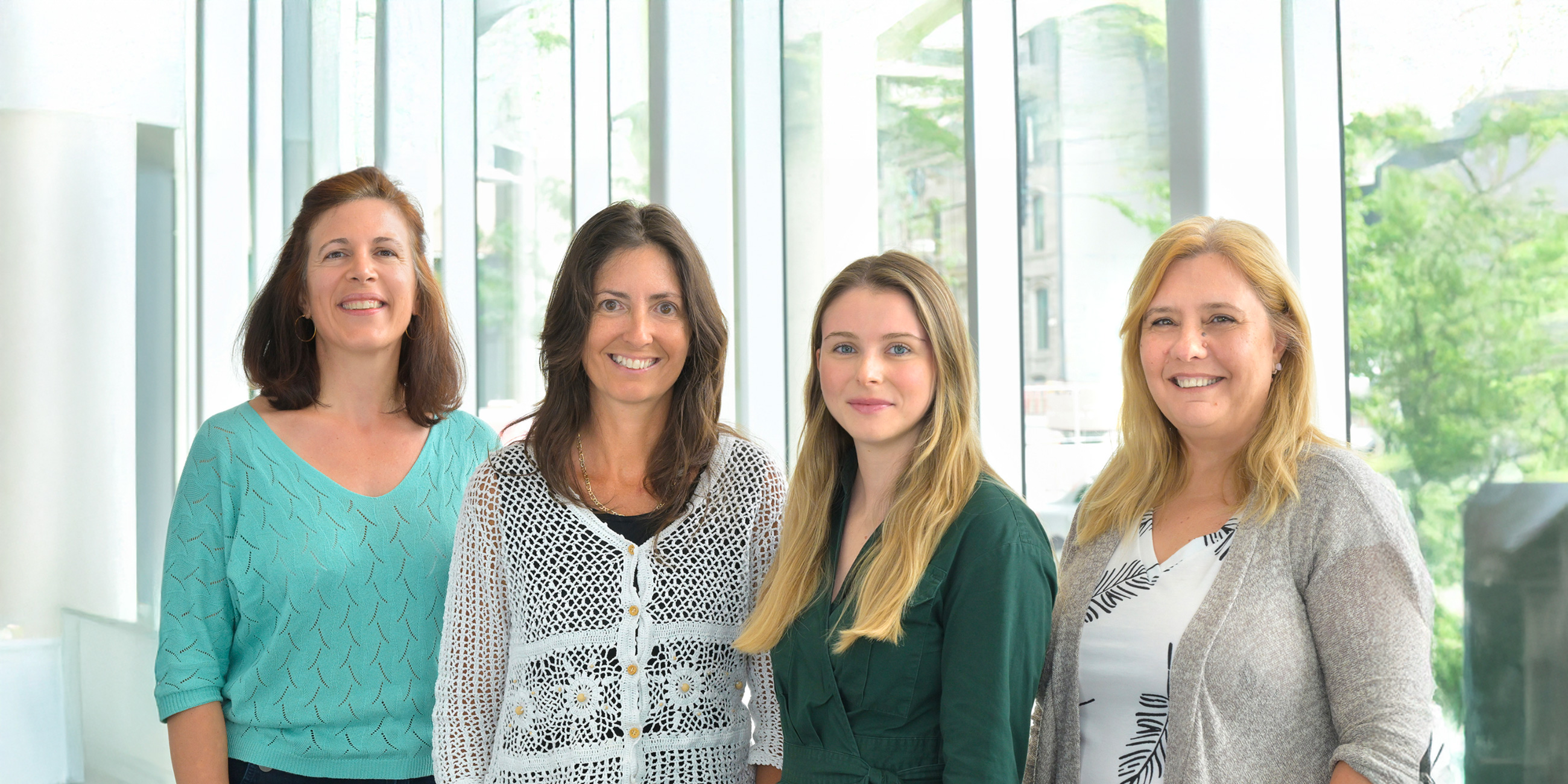 Le CHUM compte sur une équipe unie pour soutenir le modèle ECHO™. Il s’agit de (de gauche à droite) : Lucie Fuzeau, coordonnatrice des programmes d’apprentissage réseau, Isabelle Sévigny, agente de planification, de programmation et de recherche, Brenda Lécuyer, conseillère-cadre, et Mihaela Drugus, spécialiste des activités cliniques.